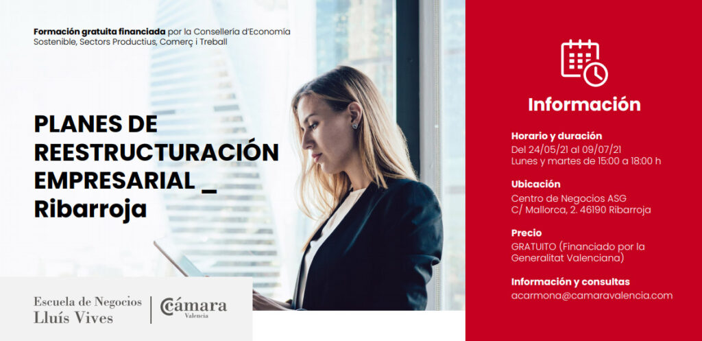 Cámara de Comercio y Rib A3 han organizado una nueva edición del curso gratuito Planes de Reestructuración Empresarial, una formación de 42 horas de formación en sesiones conjuntas, con dos sesiones de tres horas cada una para cada uno de los siete módulos. Además, incluye 10,5 horas de tutoría consultoría individual para cada empresa (una […]